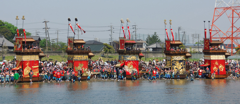 愛知県知多半島の北東部に位置する半田市亀崎地区で毎年5月3日4日に行われる「亀崎潮干祭」は、豪華な刺繍幕や精緻な彫刻で装飾された5輌の山車を干潮の海浜に曳き下す勇壮華麗な祭りです。